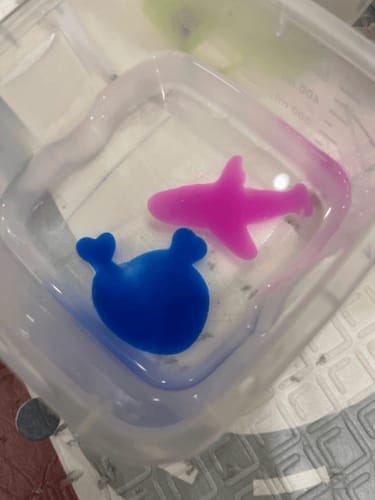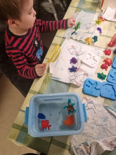 Je to senzačné, nechávam fotky! Do pohára s vodou som dala 10 guľôčok a miešala, kým sa nerozpustia. Keď sa to rozpustí, dáš farbu do formy a potom ju ponoríš do vody, stačí len premiešať tvar a za pár sekúnd sa dizajn uvoľní, potom ho vyberieš z vody s alginátom a dáš do čistej vody, dizajn rastie vo vode. Pre môjho dvojročného syna to bolo naozaj zábavné a podnetné. Vyrobili sme rybu a dali sme ju do vane...