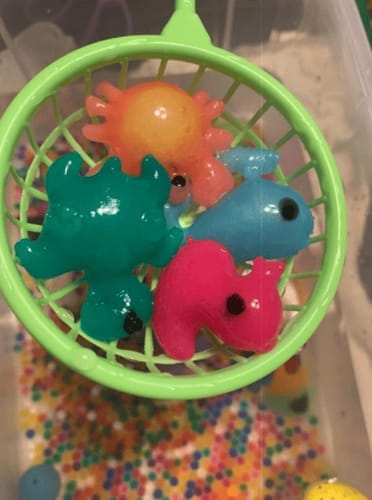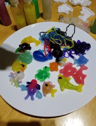 Táto súprava je veľmi dobre vyrobená. Páči sa mi, že má vlastnú nádobu na uskladnenie. Hrali sme sa hodiny a hodiny. Zdravý rozum hovorí, že ak chcete, aby farby vydržali, nepreťažujte formičky zakaždým. Nám ešte nedošla žiadna farba! Squishies sme nechali v roztoku cez noc, aby sa zabezpečilo, že vnútro poriadne zožltne. Chvíľu trvá, kým sa dajú stlačiť k sebe a hrať sa s nimi, čo môže byť ťažké vysvetliť menším deťom. Dinosaurie vajíčka a vodné korálky sú bonusom navyše. Vrelo odporúčame! Zábava pre všetky vekové kategórie.